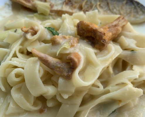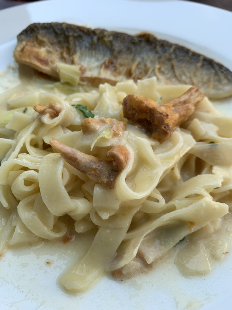 Zum Hauptgang haben wir Bodenseefelchen mit Bandnudeln, Pfifferlingen und Frühlingszwiebeln an einer leichten Weißweinsoße bestellt. Die Nudeln waren ebenso wie der Fisch perfekt gegart. Die leckere Soße hat das Gericht perfekt begleitet. Die Portion war groß genug, aber für uns hätte es allein geschmackstechnisch ruhig ein bisschen mehr sein können. Aber man soll sich ja den Bauch nicht so voll hauen – deshalb haben wir auch den Nachtisch weggelassen. Obwohl das ja fast einer Selbstkasteiung gleichkam. Die Desserts aus Liebichs Küche sind jedes Mal ein Traum. Besonders in Erinnerung sind uns zum Beispiel die Weiße Schokolade mit Chili oder die Toblerone-Mousse geblieben.