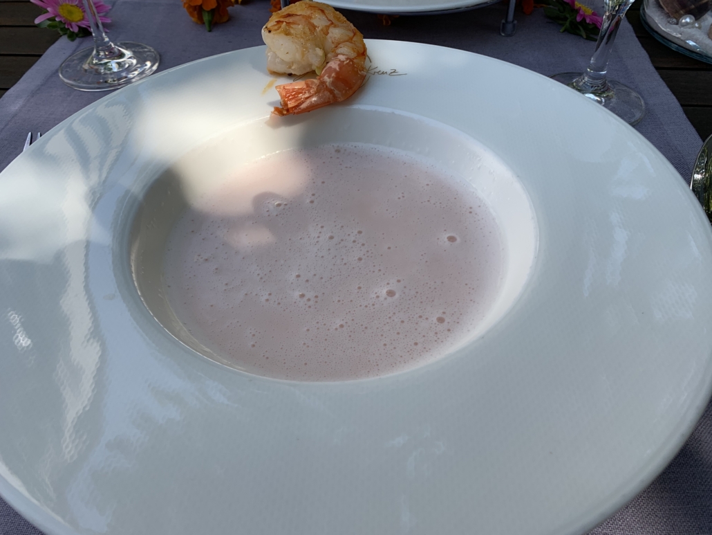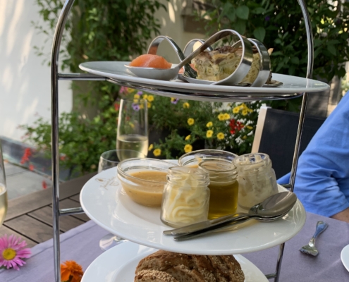 Seit diesem Erlebnis vor immerhin 16 Jahren waren wir noch öfters zu Besuch im Johanniterkreuz und jedes Mal sehr zufrieden. Anlässlich unseres Hochzeitstages im August fahren wir nach Andelshofen und lassen uns kulinarisch verwöhnen. Bei unserem letzten Besuch haben wir bei der Reservierung am Telefon erwähnt, dass wir wieder unseren besonderen Tag im Johanniterkreuz feiern wollen, und als wir ankamen, war der Tisch auf der Terrasse mit bunten Blumen dekoriert. Der Chef persönlich kam aus der Küche und hat uns gratuliert. Nach dem Aperitif ging es mit einem Gruß aus der Küche weiter. Obwohl Gruß aus der Küche doch ein bisschen untertrieben ist. Auf einer dreistöckigen Etagere befanden sich solch leckere Dinge wie hausgebeizter Lachs, eine kalte Gazpacho, Gläschen mit Butter, Olivenöl und Schmalz, ein großes Stück Gemüse-Kartoffel-Auflauf und frisches knuspriges Brot.
