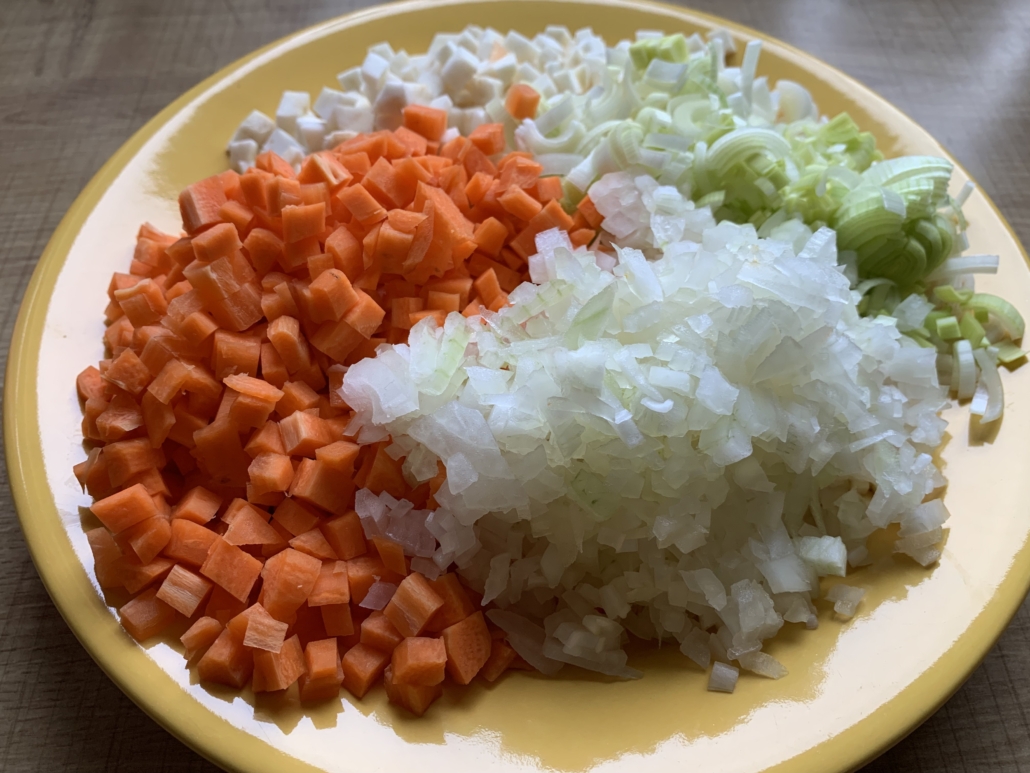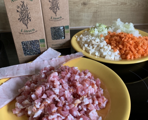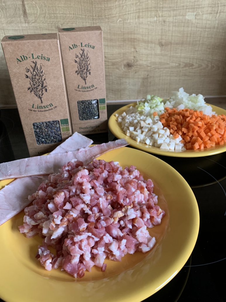 Zu den oben genannten Zutaten brauchten wir noch ein Bund Suppengemüse, eine Zwiebel, ein paar Esslöffel selbst hergestellte Brühe, 2-3 Lorbeerblätter, 300 Gramm mildgeräucherten Bauchspeck, Salz, Pfeffer, Rotweinessig und 3-4 Liter Wasser – je nachdem wie saugfreudig die Linsen sind.